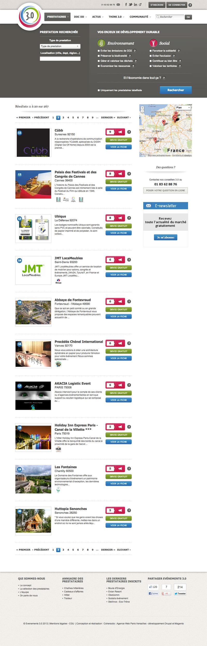 Evénements 3.0 est une plateforme de mise en relation clients/fournisseurs dans le secteur de l'événementiel. Sa particularité est de proposer des prestataires engagés dans une démarche de développement durable.
