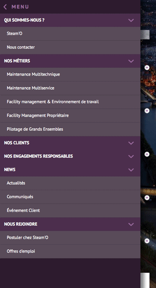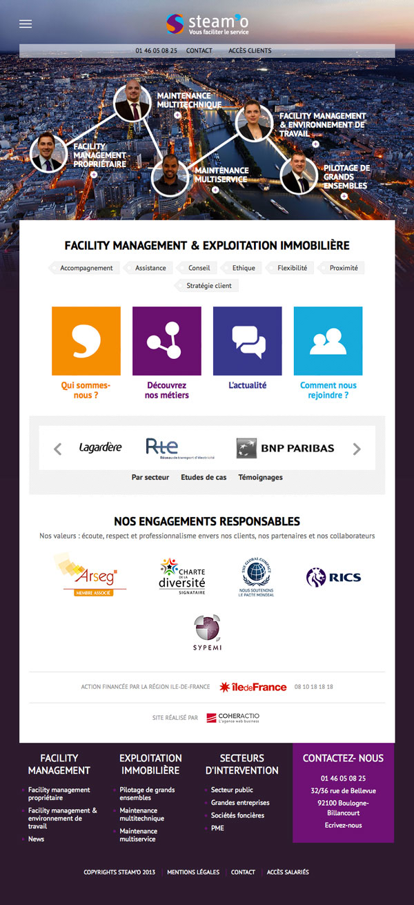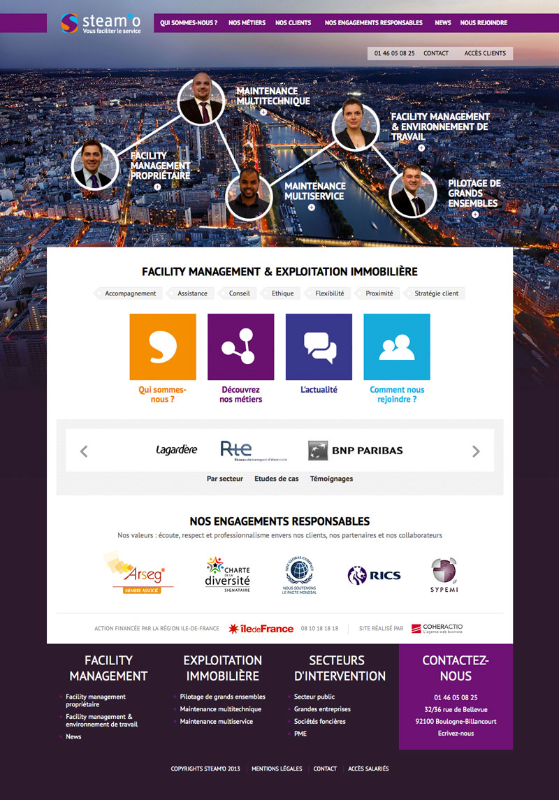 Coheractio a conduit la refonte du site Internet avec un double objectif : présenter clairement l'offre de services et différencier Steam'O de ses concurrents par un design graphique appuyé.