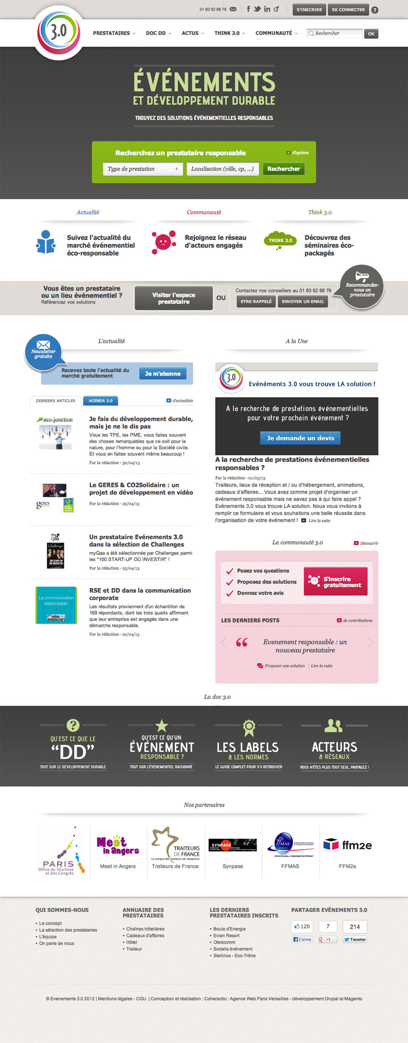 Evénements 3.0 est une plateforme de mise en relation clients/fournisseurs dans le secteur de l'événementiel. Sa particularité est de proposer des prestataires engagés dans une démarche de développement durable.