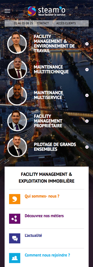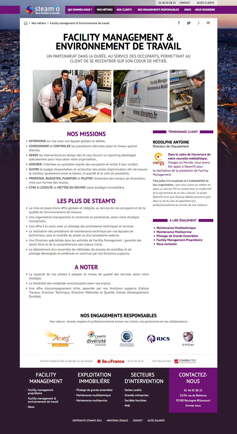 Coheractio a conduit la refonte du site Internet avec un double objectif : présenter clairement l'offre de services et différencier Steam'O de ses concurrents par un design graphique appuyé.